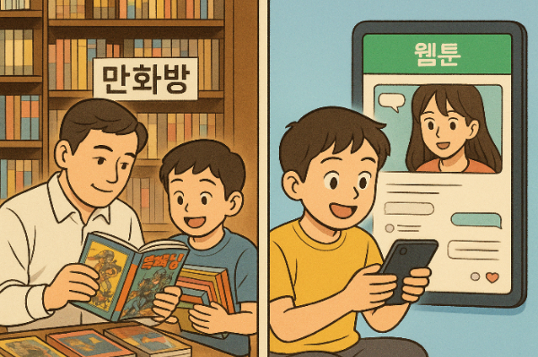 겉보기에는 참 다릅니다. 부모 세대는 두꺼운 만화책을 들고 만화방에서 친구와 어깨를 맞대고 웃었고, 아이 세대는 스마트폰 화면을 스크롤하며 실시간으로 전 세계 독자들과 이야기를 나눕니다. 하지만 그 본질은 닮아 있습니다.