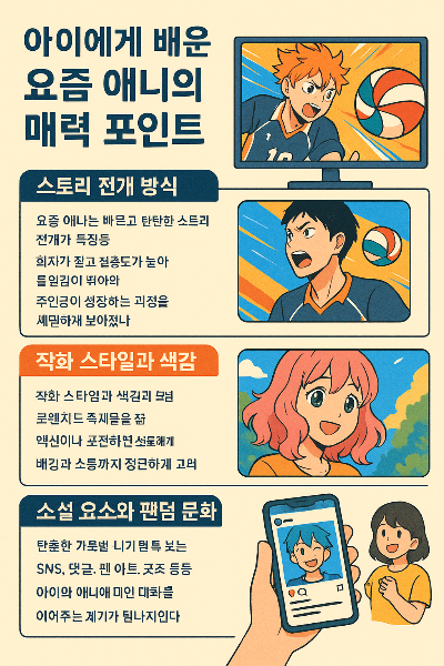 아이에게 요즘 애니의 매력을 배우면서 부모도 스토리 전개, 작화, 몰입 포인트, 그리고 소셜 팬덤 문화를 자연스럽게 이해하게 됩니다. 이 과정에서 부모와 아이는 단순히 콘텐츠를 공유하는 것이 아니라, 서로의 취향과 사고방식을 존중하며 공감할 수 있는 기회를 가지게 됩니다.